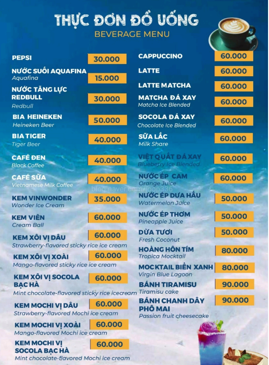 한글 메뉴판 없고, 베트남어와 영어로 되어있는 메뉴판임.